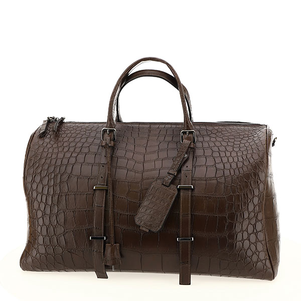 Luxury and precious week end bag realized in genuine brown crocodile leather. The leather - covered padlock let you close your bag safely.