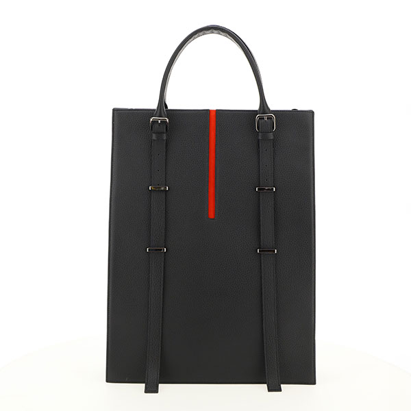 Design bag with a touch of red leather. Realized with pebbled black leather. Shoulder strap and gun metal details