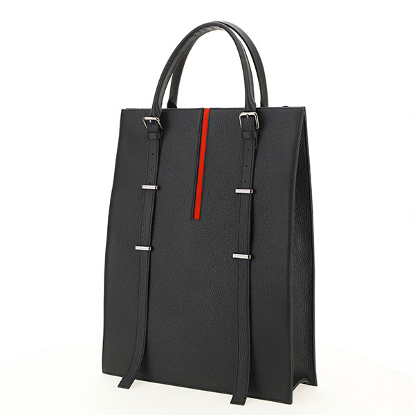 Design bag with a touch of red leather. Realized with pebbled black leather. Shoulder strap and gun metal details.